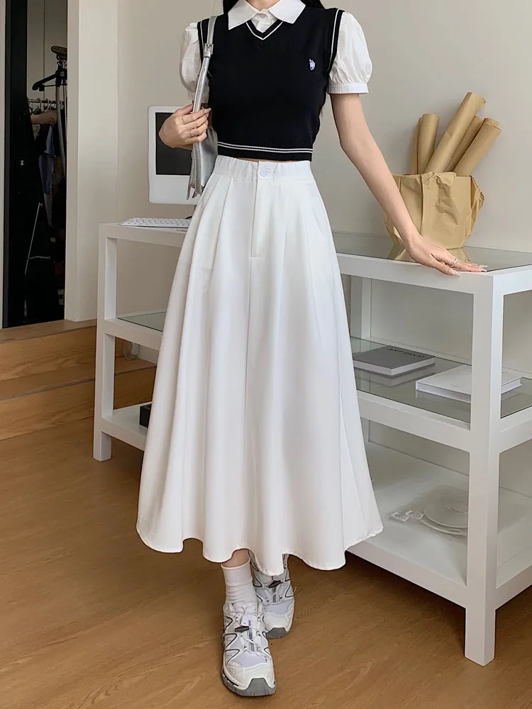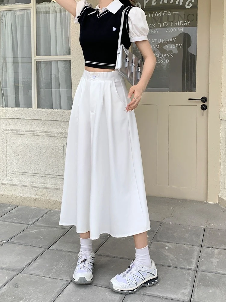Waist: High Waist Length: Long Embellished: None Silhouette: A-Line Pattern: Solid Style: Casual Material: Polyester Gender: Women Color: Amber,White,Black Size: S-L..