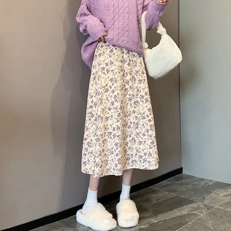 Floral Print Long Skirts Women Summer A Line Beach Skirts Women Elastic High Waist Midi Skirt