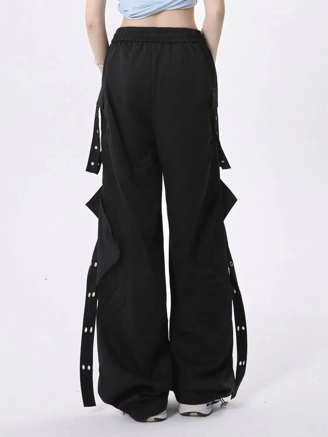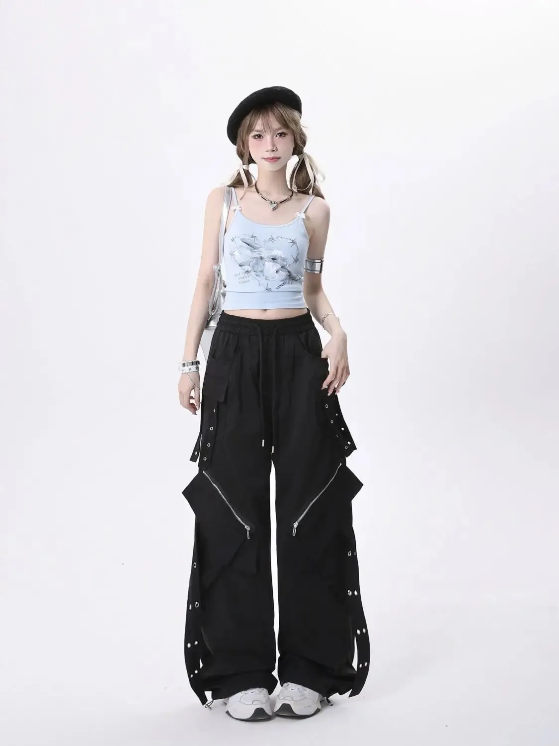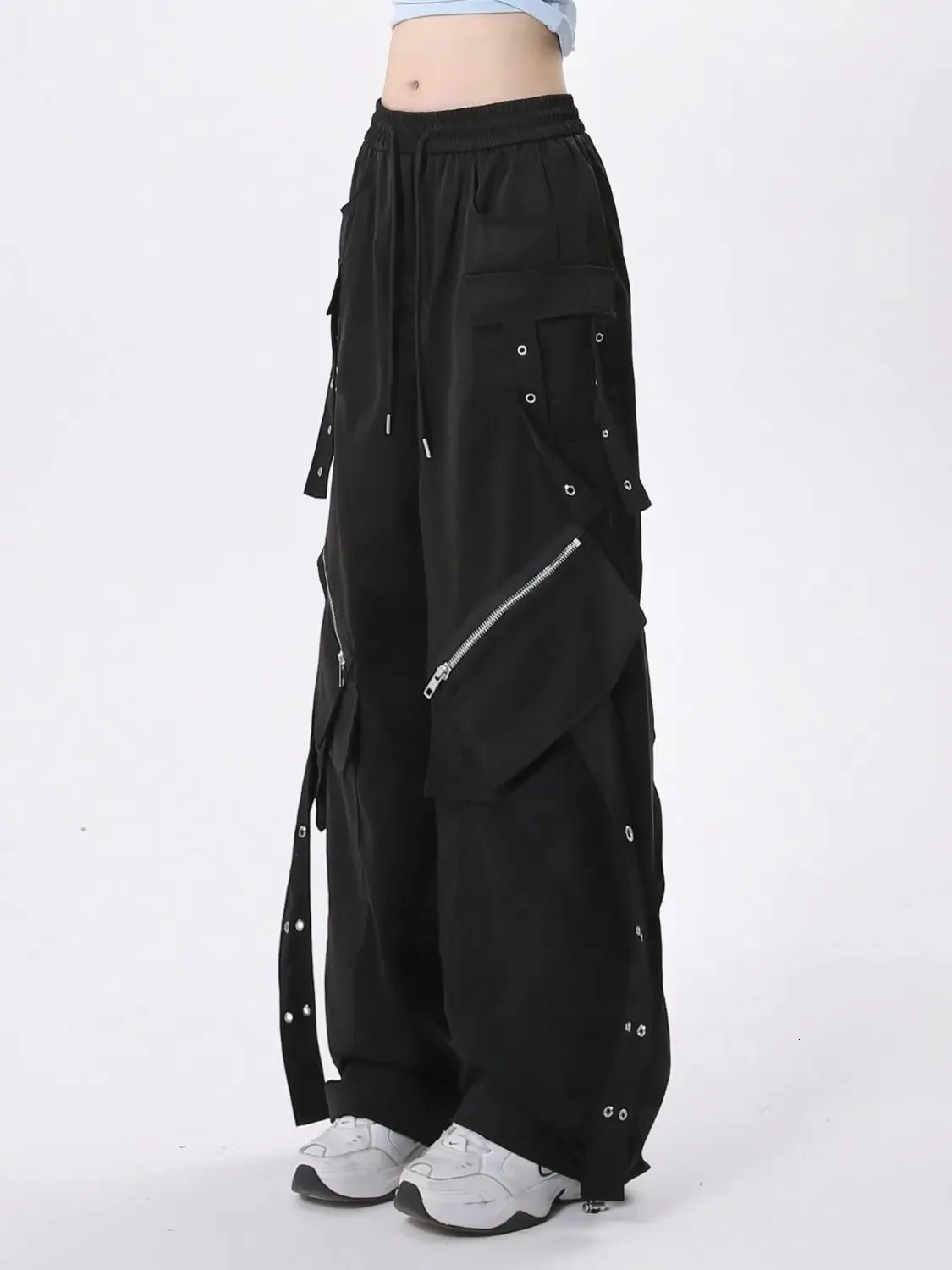 Trend Zipper Large Pocket Elastic Waist Pants for Women Street Hip Hop Casual Versatile Wide Leg Trousers