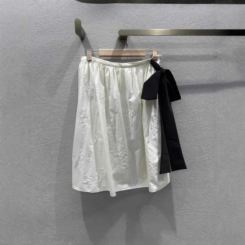 Skirts Women Fashion Spring Summer Embroidered Cotton Color-Block Tie Silk Skirt