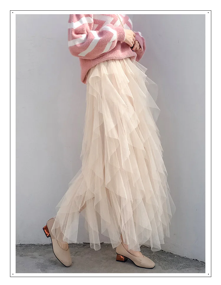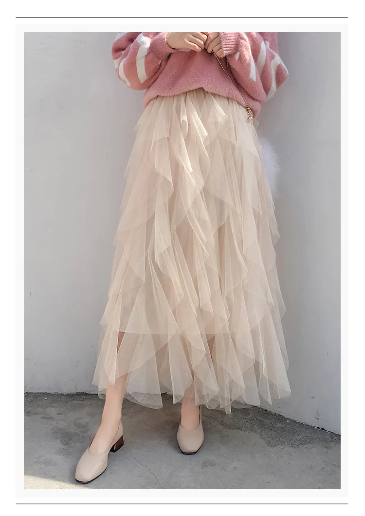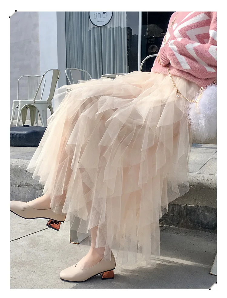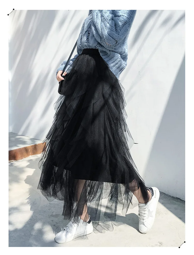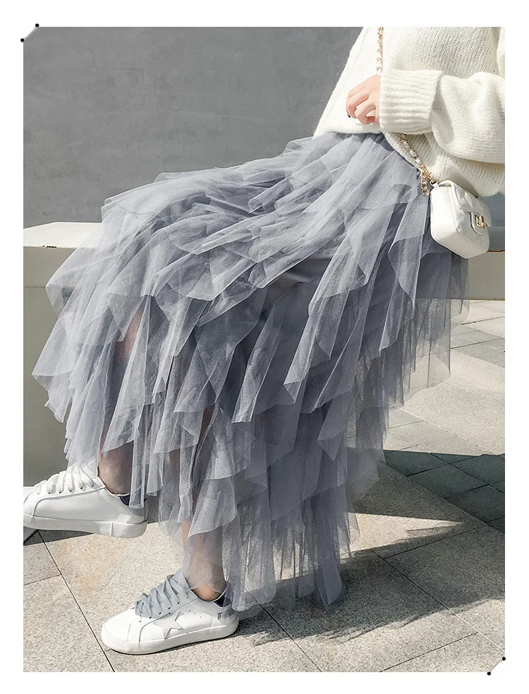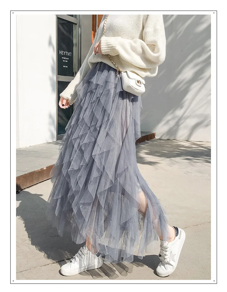 Women's Mesh Cake Umbrella Maxi Skirt Solid Color High Waist Pleated Fashion Women's Maxi Skirt