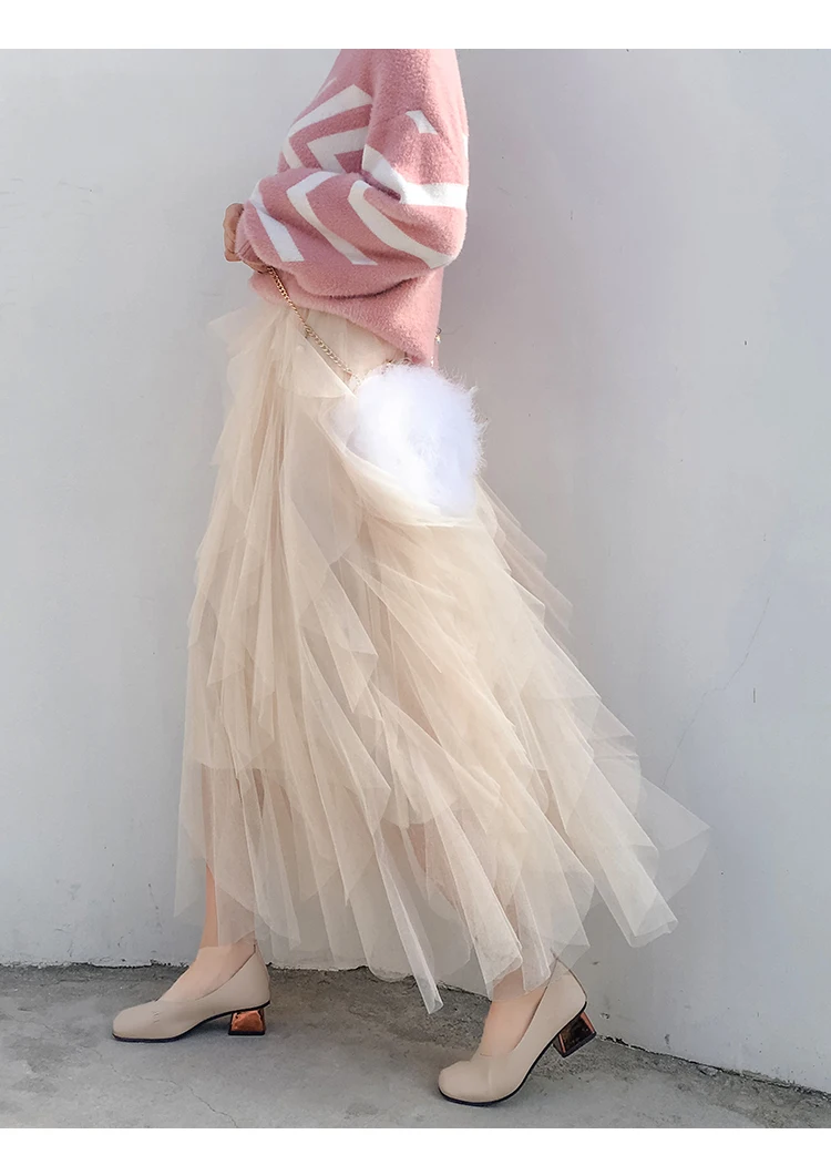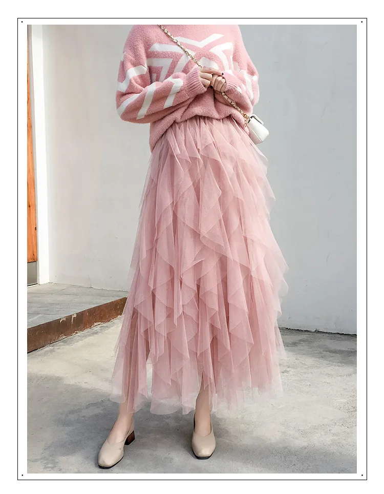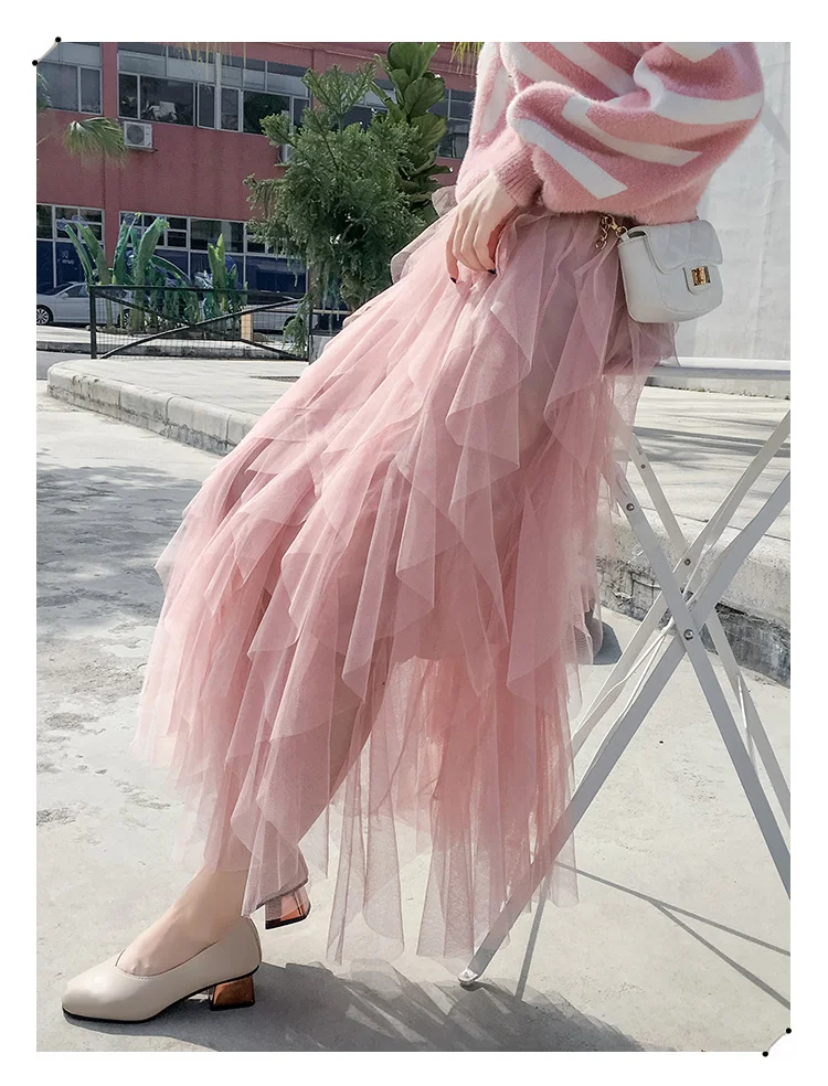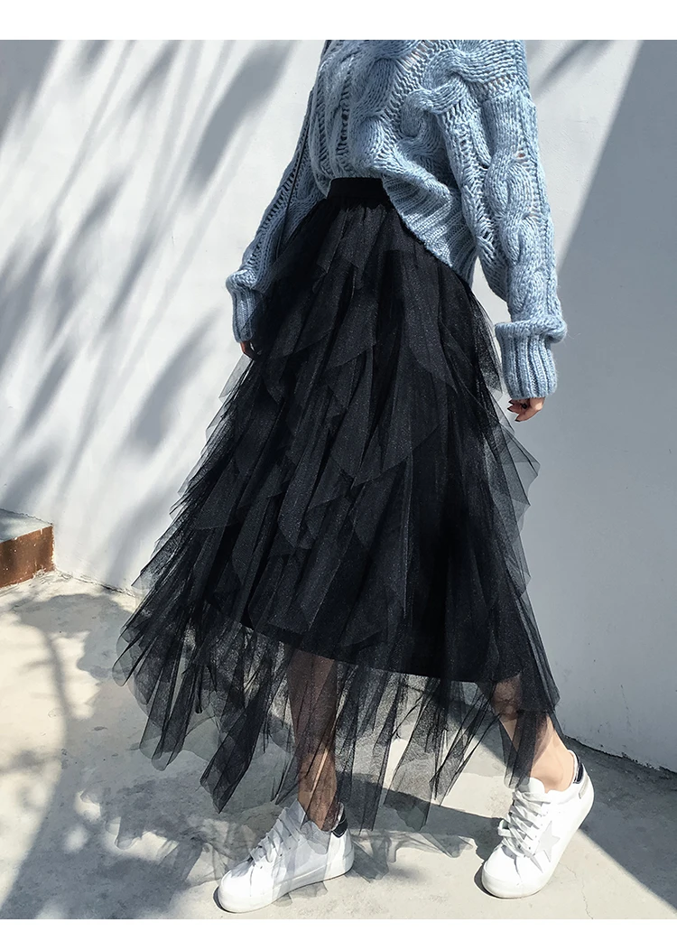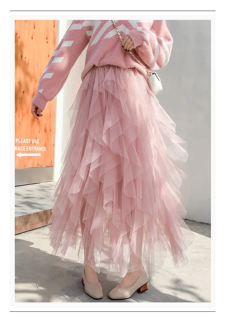 Women's Mesh Cake Umbrella Maxi Skirt Solid Color High Waist Pleated Fashion Women's Maxi Skirt